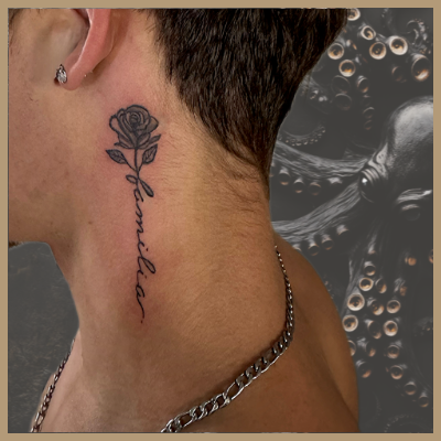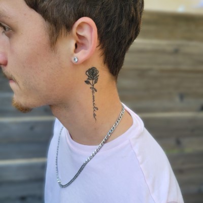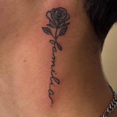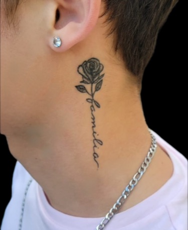 Sur cette photo, on découvre une rose fine line accompagnée du mot « familia », discrètement placée sur le côté du cou, juste sous l’oreille. Un emplacement à la fois visible, personnel, et exigeant.